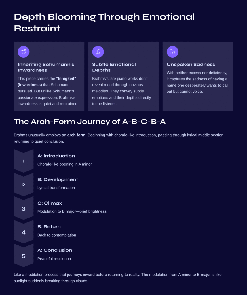 Looking at this piece’s structure, we find Brahms unusually employing an arch form. Beginning with a chorale-like introduction, passing through a lyrical middle section, and returning to a quiet conclusion—it’s like a meditation process that journeys inward before returning to reality.