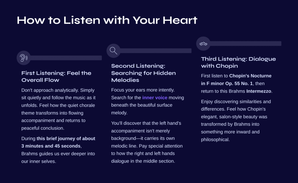 On your second hearing, focus your ears more intently. Search for the inner voice moving beneath the beautiful surface melody. You’ll discover that the left hand’s accompaniment isn’t merely background—it carries its own melodic line.