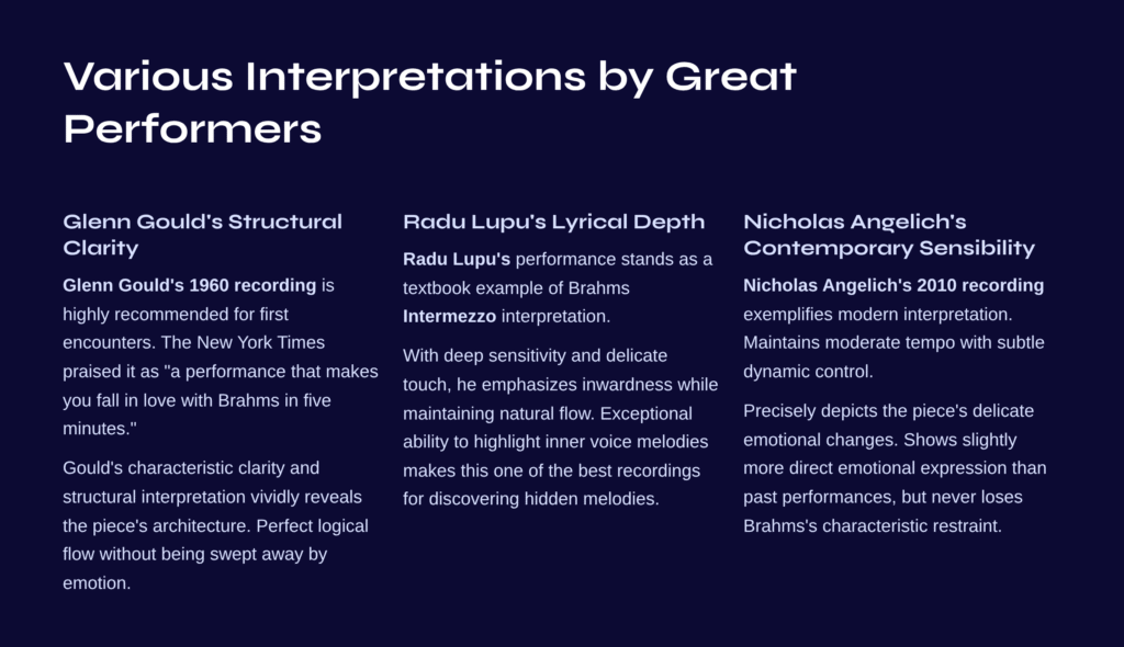 Radu Lupu’s performance stands as a textbook example of Brahms Intermezzo interpretation. With deep sensitivity and delicate touch, he emphasizes inwardness while maintaining natural flow. His exceptional ability to highlight inner voice melodies makes this one of the best recordings for discovering hidden melodies.