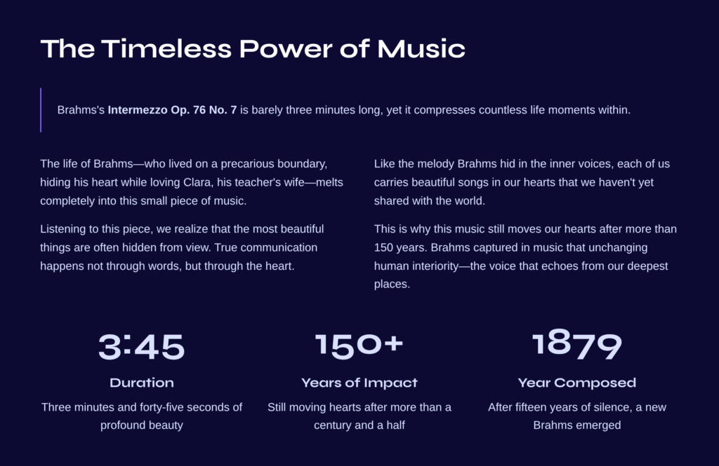 Listening to this piece, we realize that the most beautiful things are often hidden from view. And that true communication happens not through words, but through the heart. Like the melody Brahms hid in the inner voices, each of us carries beautiful songs in our hearts that we haven’t yet shared with the world.