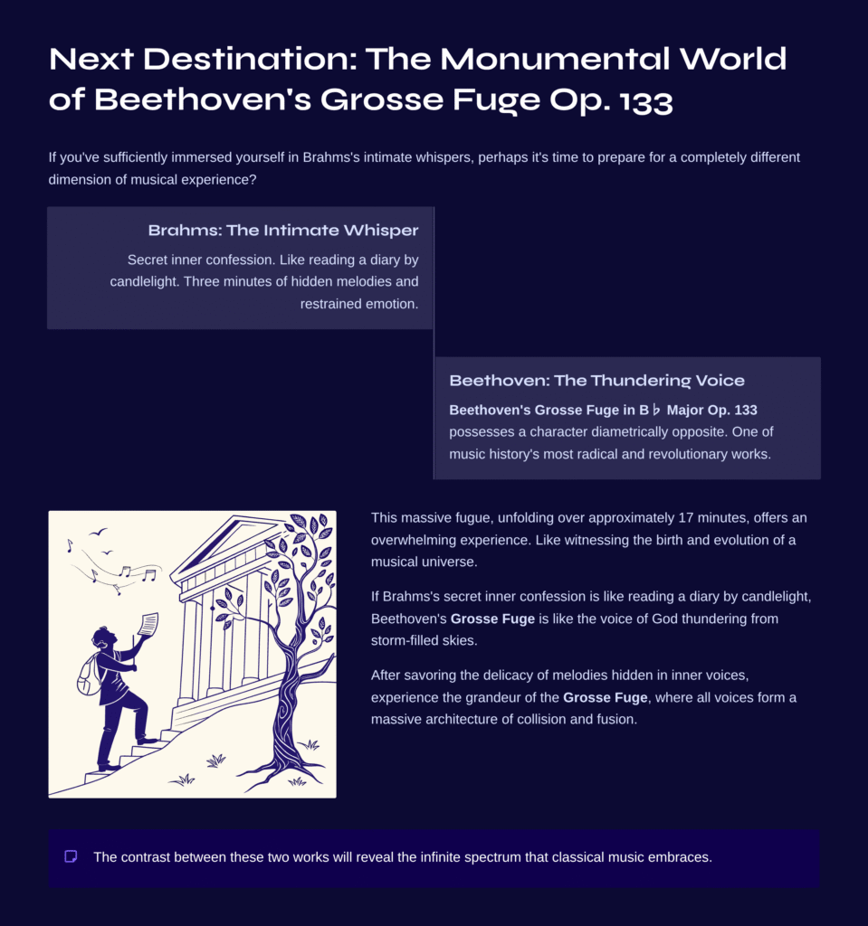 After savoring the delicacy of melodies hidden in inner voices, experience the grandeur of the Grosse Fuge, where all voices form a massive architecture of collision and fusion. The contrast between these two works will reveal the infinite spectrum that classical music embraces.