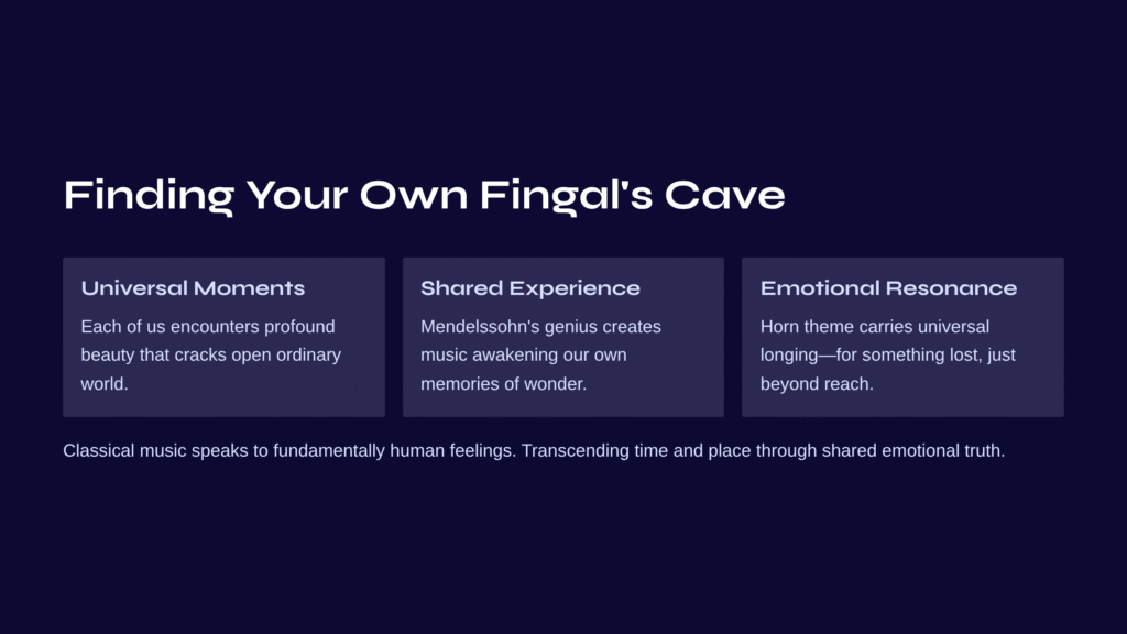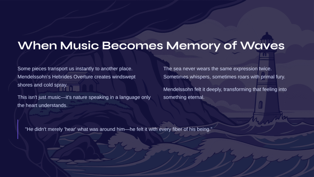 The sea never wears the same expression twice. Sometimes it whispers secrets in gentle murmurs, other times it roars with primal fury. That Mendelssohn’s inspiration from a mysterious Scottish cave still moves us two centuries later speaks to something profound: he didn’t merely ‘hear’ what was around him—he felt it with every fiber of his being, then transformed that feeling into something eternal.