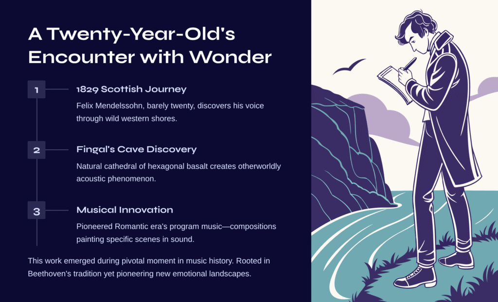 When Felix Mendelssohn embarked on his Scottish journey in 1829, he was barely twenty years old. Imagine it: a young composer, already brilliant but still discovering his voice, standing before the wild western shores and the enigmatic Fingal’s Cave. The overwhelming sensation he must have felt in that moment of pure encounter with nature’s raw beauty.