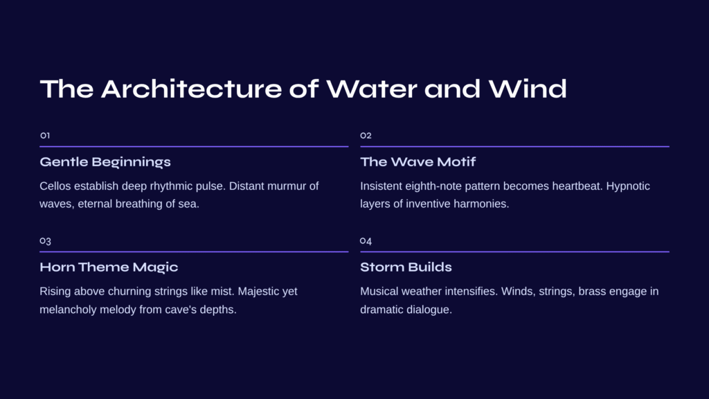 The climax builds not through raw volume alone but through the sophisticated interweaving of themes. The wave motif continues its relentless pulse while the horn melody soars above, creating a sonic representation of standing in a storm while remaining emotionally centered—overwhelmed by nature’s power yet somehow at peace with it.