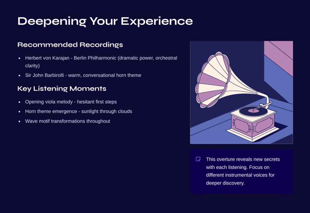 This overture reveals new secrets with each listening. Try focusing on different instrumental voices: follow the intricate conversation between woodwinds and strings, notice how Mendelssohn uses dynamics to create a sense of distance and proximity, observe how the wave motif transforms throughout the piece. Like the sea itself, this music has depths that reward patient exploration.