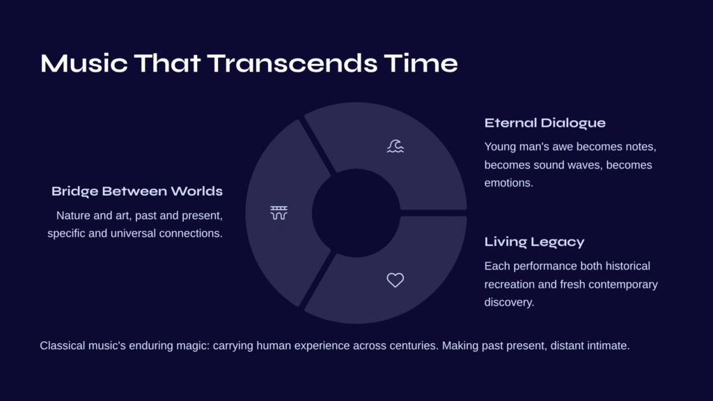 This is classical music’s enduring magic: the way it carries human experience across centuries, making the past present and the distant intimate. Each performance is both a historical recreation and a new creation, both tribute to the composer’s original vision and fresh discovery for contemporary ears.