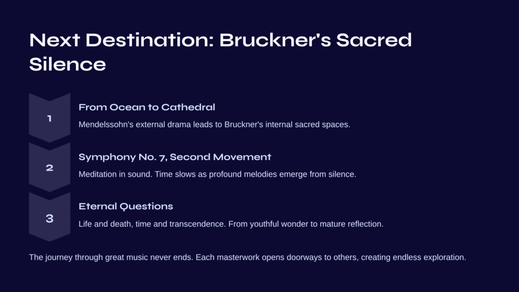 The journey through great music is never really complete, is it? Each masterwork opens doorways to others, creating an endless exploration of human experience transformed into sound. Let the waves of Mendelssohn carry you toward new shores of discovery.