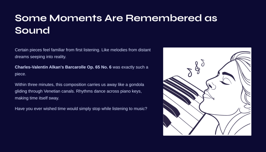 Certain pieces of music feel familiar from the very first listening, as if we’ve always known them. Like melodies from distant dreams seeping into reality. Charles-Valentin Alkan’s Barcarolle Op. 65 No. 6 was exactly such a piece for me.