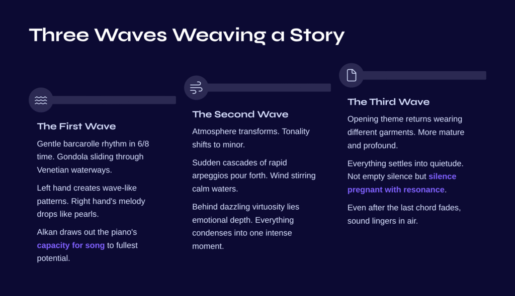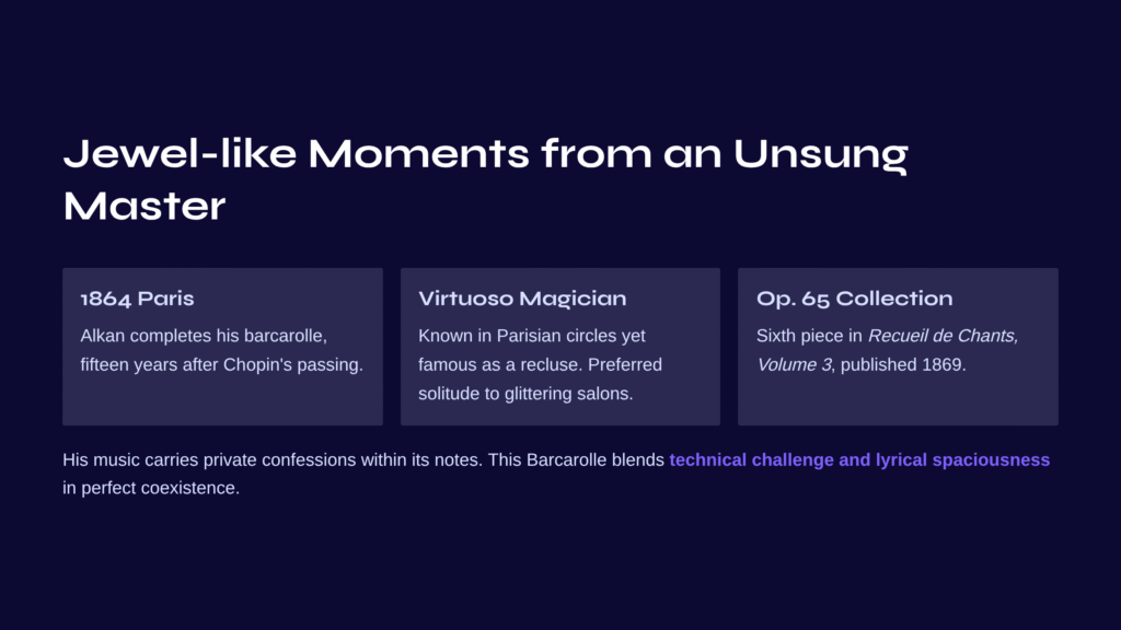 In 1864, within a Parisian composition room, Charles-Valentin Alkan was completing his own barcarolle. This was already fifteen years after Chopin’s passing, while Liszt continued his dazzling concert tours across Europe.