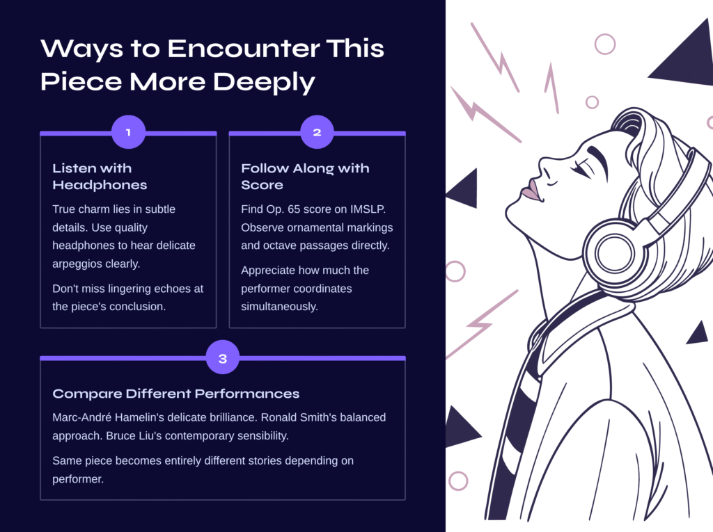 Find the Op. 65 score on IMSLP and listen while following along. Observing the ornamental markings and octave passages directly will help you appreciate how much the performer must coordinate simultaneously, making the music feel more three-dimensional.