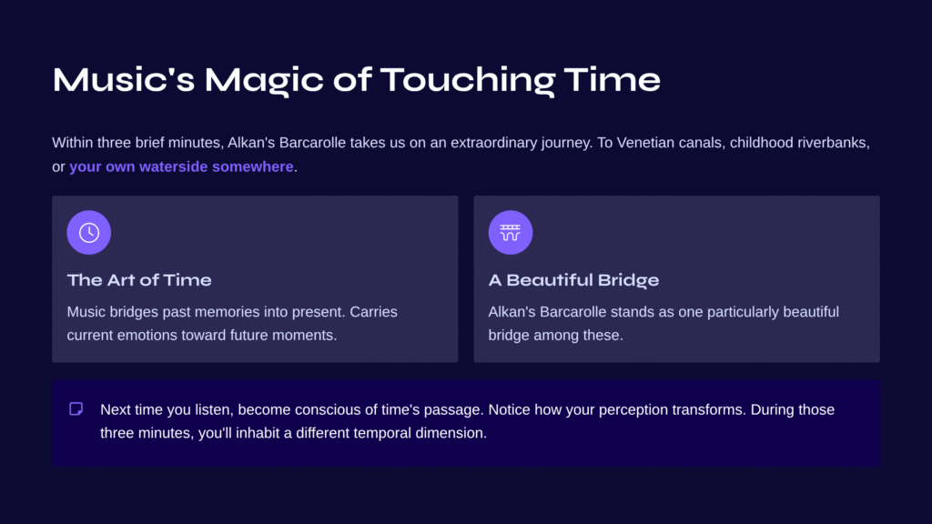 Music is ultimately the art of manipulating time. It bridges past memories into the present and carries current emotions toward future moments. Alkan’s Barcarolle stands as one particularly beautiful bridge among these.