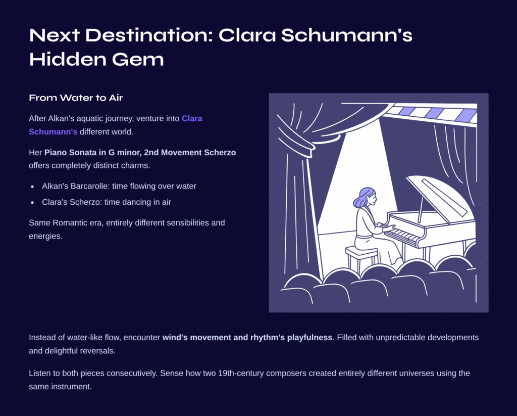 If Alkan’s Barcarolle represents time flowing over water, Clara’s Scherzo embodies time dancing in air. Same Romantic era, yet entirely different sensibilities and energies. The musical personality and creativity that Clara displays as a female composer will lead you toward fresh surprises.