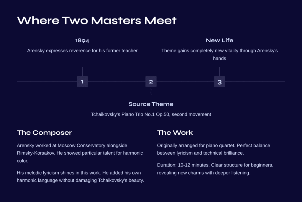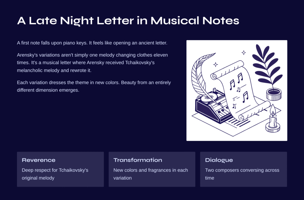 This piece is not simply a story of one melody changing clothes eleven times. It is a musical letter where Arensky received Tchaikovsky’s melancholic melody and rewrote it in his own language. While respecting the profound emotions of the original, each variation dresses the theme in new colors and fragrances, offering beauty from an entirely different dimension.