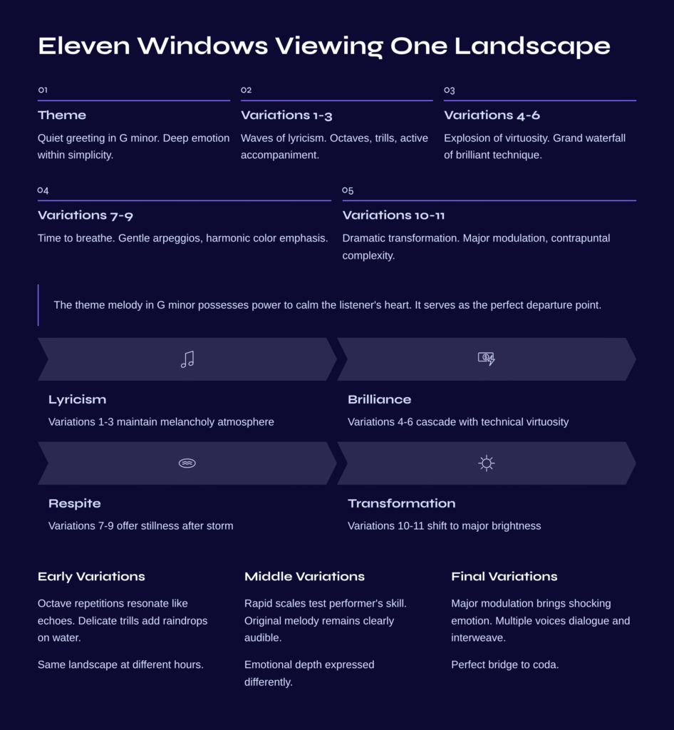 The final eleventh variation incorporates contrapuntal elements, making the musical structure more complex. This section, where multiple voices dialogue and interweave with each other, feels like multiple narrators simultaneously telling the same story from different perspectives. Dramatic tension reaches its peak, serving as a perfect bridge leading to the coda.
