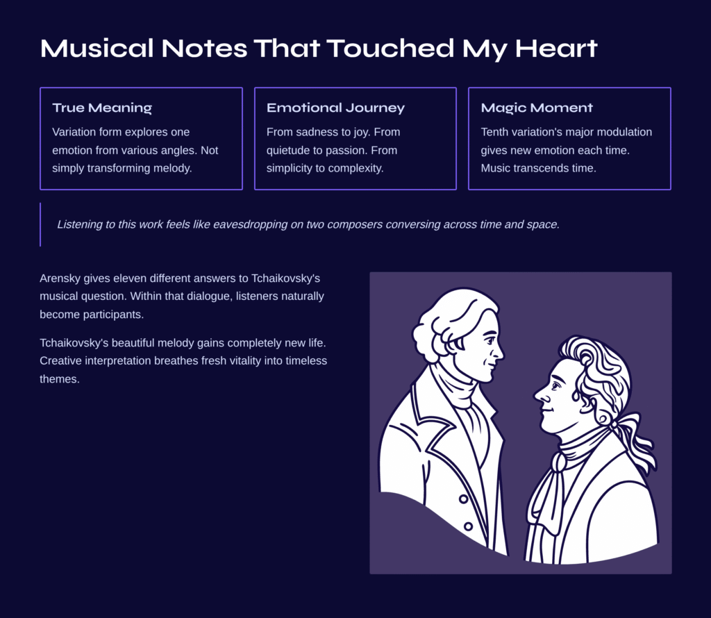 When I first heard this piece, I realized the true meaning of the variation form. It’s not simply transforming a melody, but a process of exploring one emotion from various angles. The melancholy of Tchaikovsky’s original continuously changes through Arensky’s hands—from sadness to joy, from quietude to passion, from simplicity to complexity.