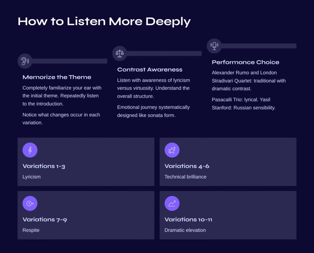 To properly appreciate this work, it’s good to pay attention to several points. First, it’s important to completely familiarize your ear with the initial theme. By repeatedly listening to the introduction and memorizing that melody line, you can more clearly notice what changes occur in each variation.
