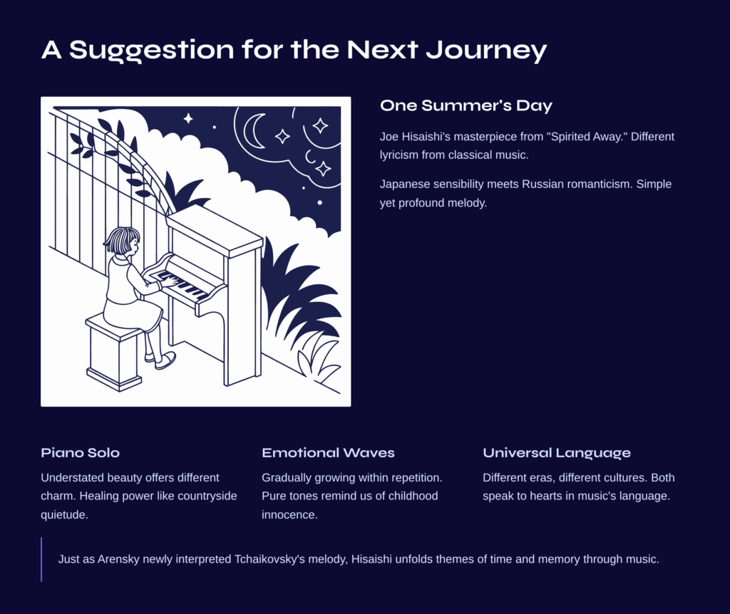 If the emotion gifted by Arensky’s variations still lingers in your heart, how about a journey to a slightly different world? Joe Hisaishi’s “One Summer’s Day” is a piece with a different kind of lyricism from classical music.