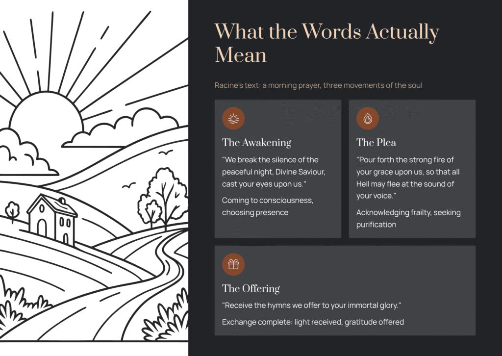 Even if you don’t speak French, knowing what’s being sung changes how you hear the music. Racine’s text is a morning prayer divided into three movements of the soul: