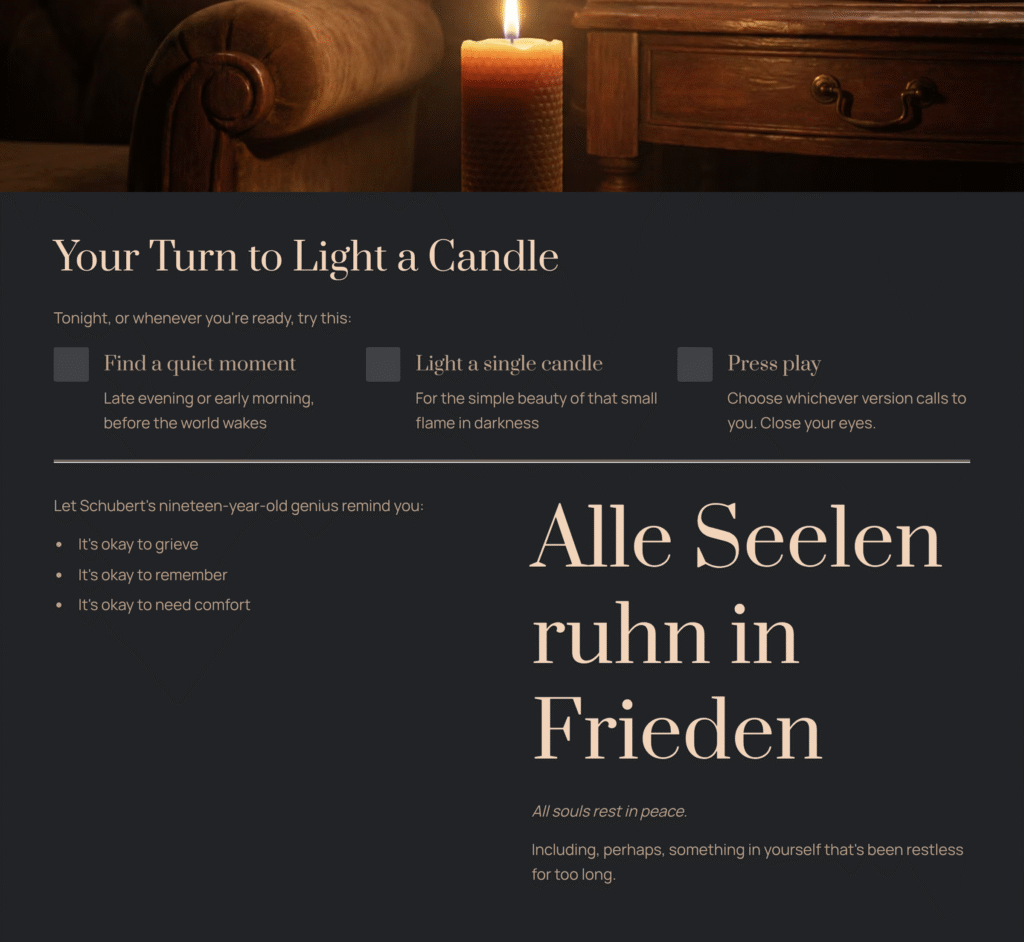 Let Schubert’s nineteen-year-old genius remind you that it’s okay to grieve, okay to remember, okay to need comfort. Let the same melody wash over you again and again, each repetition smoothing something rough inside you, until you, too, can whisper: Alle Seelen ruhn in Frieden.
