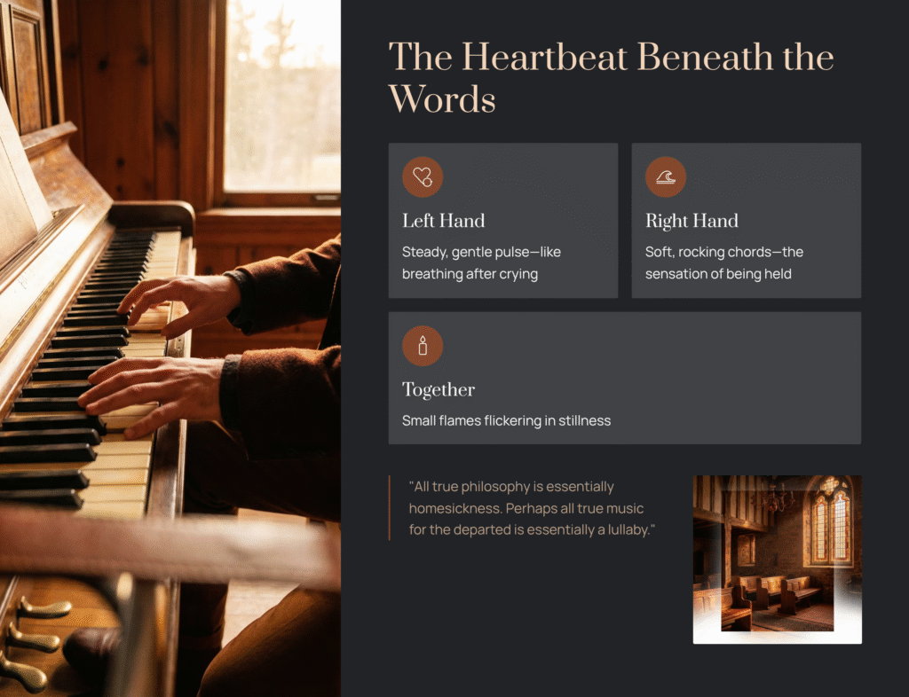 In the pianist’s left hand, you’ll hear a steady, gentle pulse. Not dramatic. Not insistent. Just there, like the rhythm of breathing when you’re finally calm after crying. The right hand adds soft, rocking chords that sway back and forth, creating a sensation of being held, being comforted.