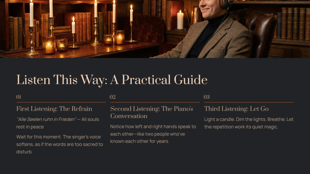 Close your eyes and imagine this: you’re in a small chapel, late afternoon, November light filtering through stained glass. Someone is lighting candles, one by one. The piano accompaniment is the sound of those small flames flickering in the stillness. It doesn’t demand your attention—it simply creates a space where grief can exist without being overwhelming.
