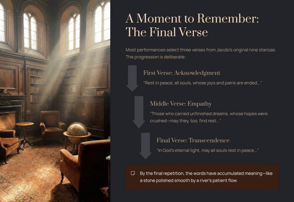 Most performances select just three verses from Jacobi’s original nine-stanza poem. The progression is deliberate, moving from acknowledgment to empathy to transcendence: