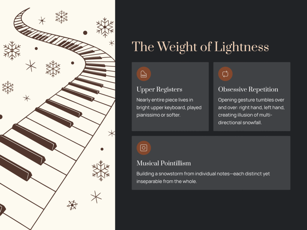 The opening gesture repeats obsessively, a small musical cell that tumbles over and over: right hand, left hand, right hand, left hand. This alternating pattern creates the illusion that snow is falling from multiple directions at once, that the air itself is filled with these tiny, dancing presences. It’s the musical equivalent of pointillism—those French painters who built entire landscapes from individual dots of color. Debussy builds a snowstorm from individual notes, each one distinct yet inseparable from the whole.
