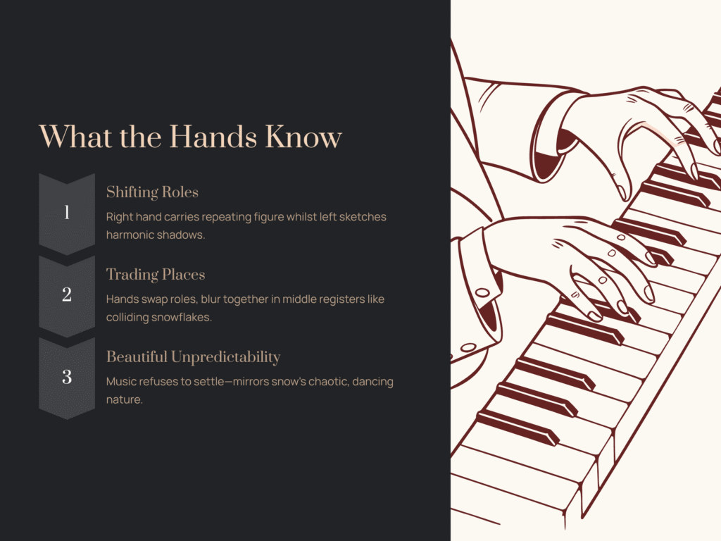 Watch a pianist’s hands during this piece, if you can. They tell their own story. The roles keep shifting: sometimes the right hand carries the main repeating figure while the left hand sketches harmonic shadows beneath; sometimes they trade places; sometimes both hands blur together in the middle registers like snowflakes colliding mid-air.