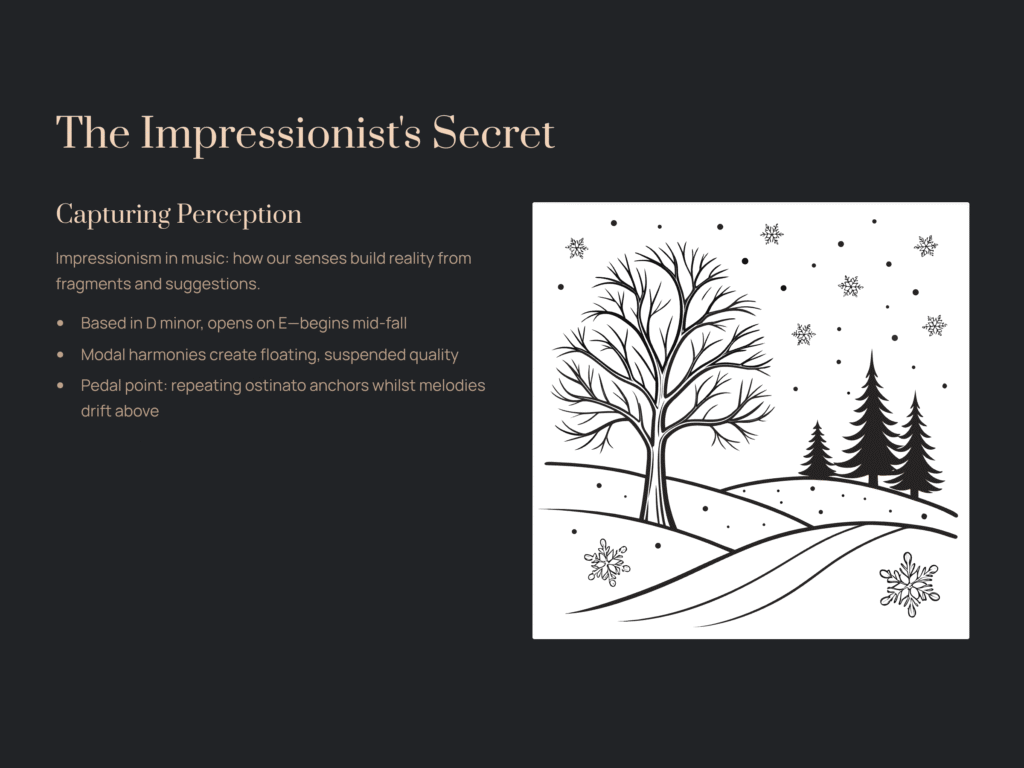 Debussy is often called an impressionist composer, and this piece shows you exactly why. But impressionism in music isn’t just about creating hazy, dream-like atmospheres. It’s about capturing the way perception actually works—the way our senses build reality from fragments and suggestions rather than solid facts.