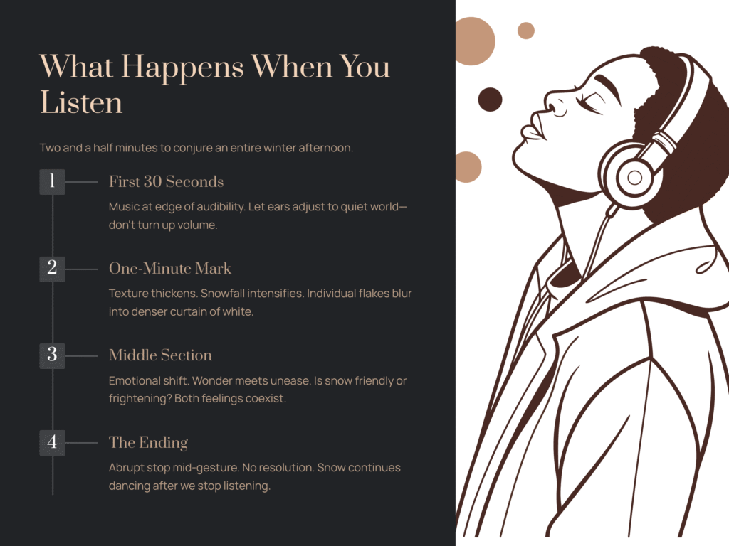 The ending: And then, without warning, it stops. No slowing down, no gentle fade, no comforting resolution. The music just ends, mid-gesture, as if the snow is still falling but we’ve simply looked away. This abrupt conclusion is deliberate—it captures something profound about winter, about nature’s indifference to our need for closure. The snow was dancing before we noticed, and it will continue dancing after we stop listening.