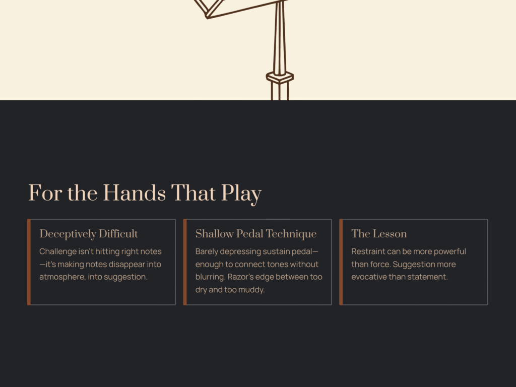 Professional pianists use what’s called a “shallow pedal” here: just barely depressing the sustain pedal, enough to connect the tones without blurring them. It’s a razor’s edge between too dry and too muddy, and finding that balance requires the kind of control that only comes from years of practice. But you don’t need to play it to understand what it’s teaching: that restraint can be more powerful than force, that suggestion can be more evocative than statement.