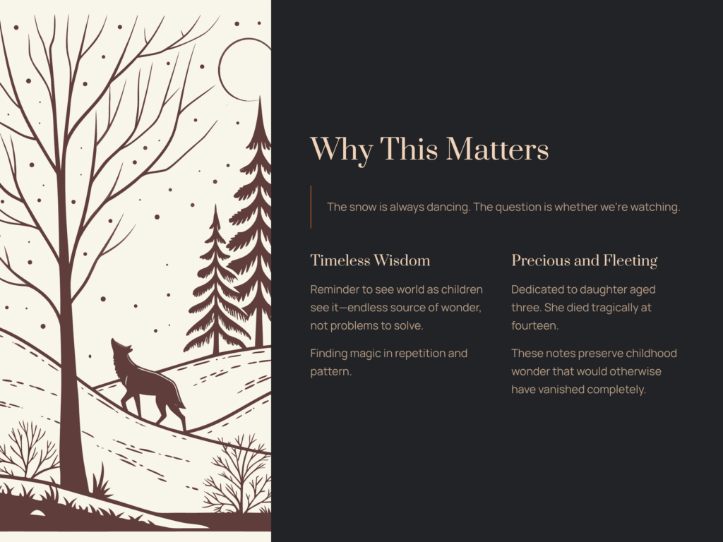 The snow keeps dancing. The music keeps playing. And somewhere in that intersection of sound and silence, movement and stillness, we find something worth preserving: the memory of when the world was still new, when snow was not just frozen water but proof that the universe could be both beautiful and strange.