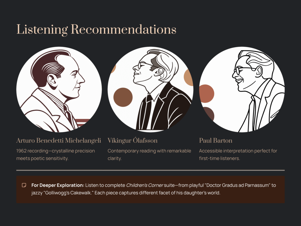 Debussy dedicated Children’s Corner to his daughter when she was three years old. She died tragically at fourteen, outliving her father by only a year. I think about that sometimes when I listen to this music—how Debussy caught something precious and fleeting, how these notes preserve a moment of childhood wonder that would otherwise have vanished completely.